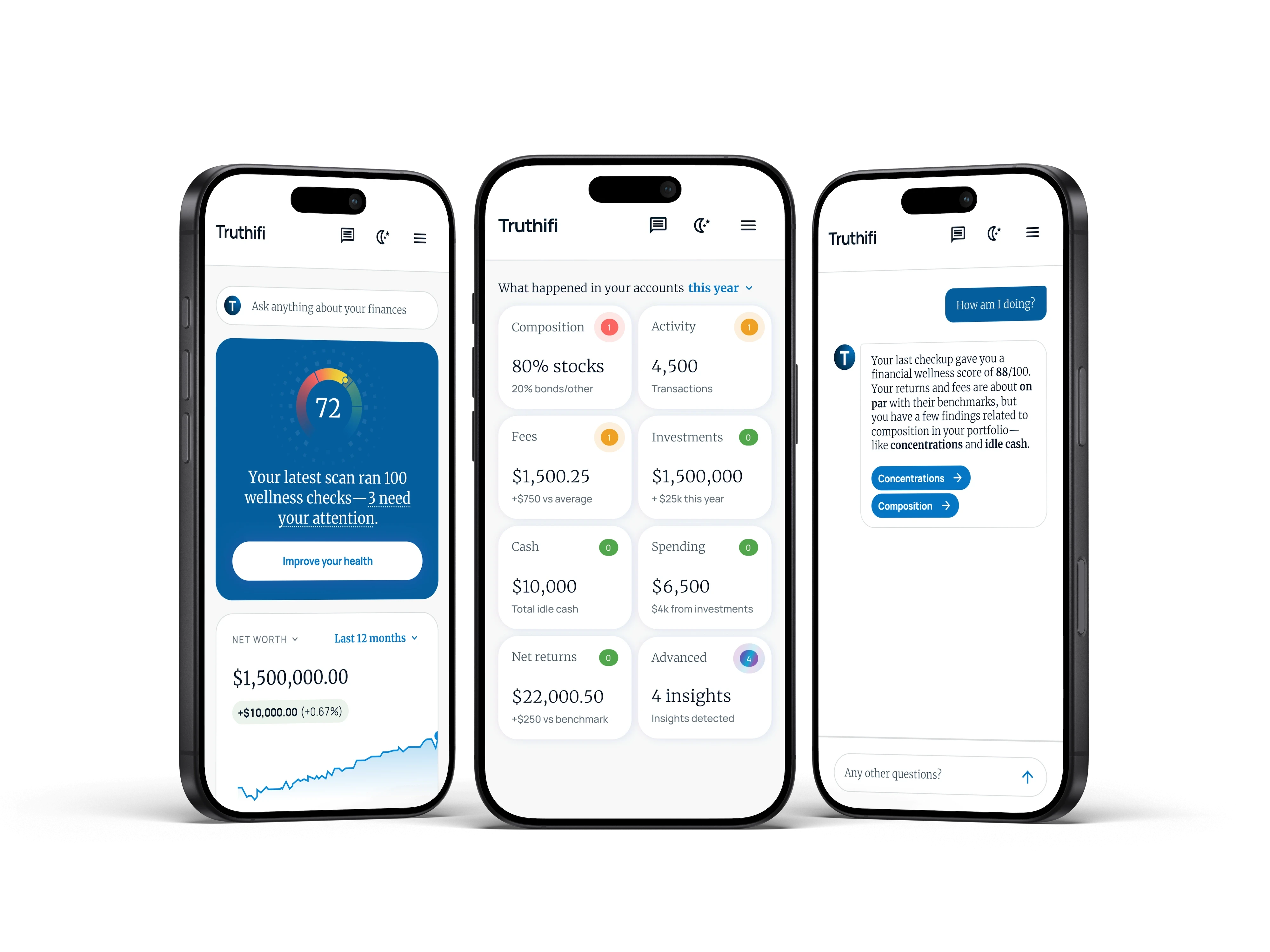 Unlike standard portfolio trackers, Truthifi automatically scans for costly fees, concentration risk, and optimization gaps—then shows you what matters in plain English.
