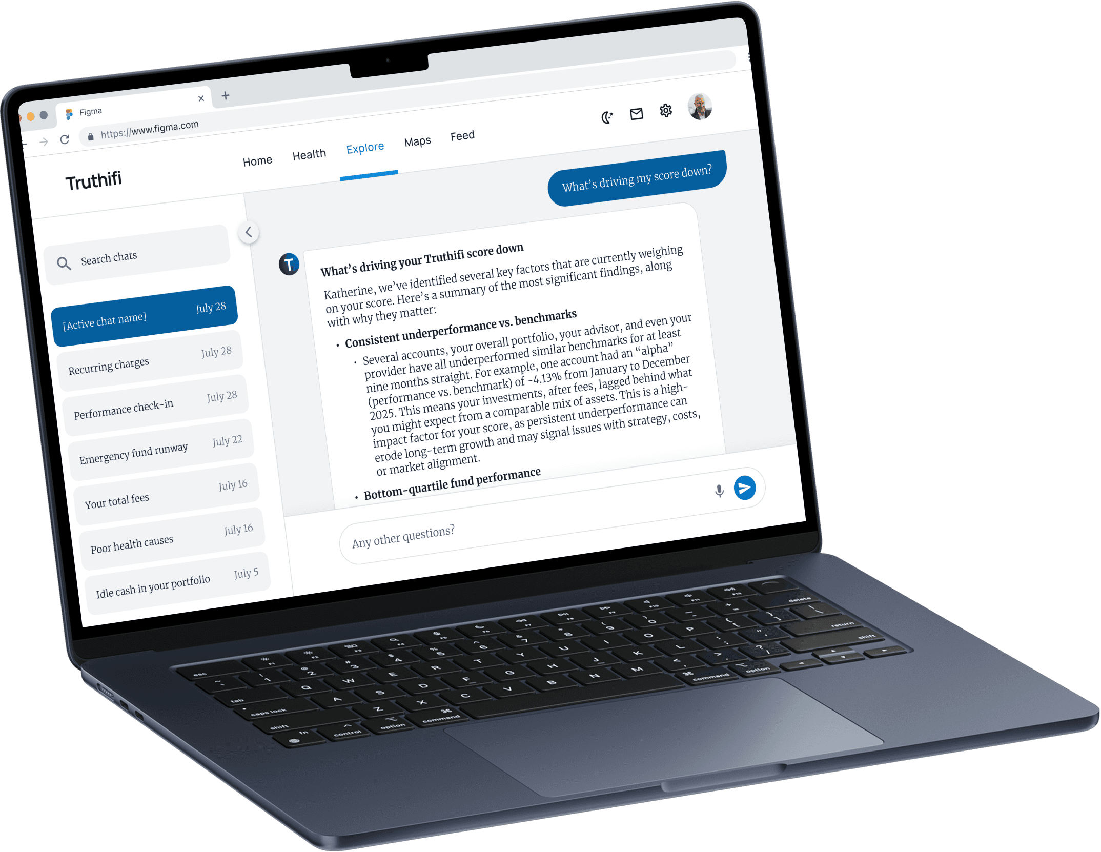 Most tracking apps show balances and performance. Truthifi monitors for deeper issues like risk changes, rising fees, concentrations, and strategy misalignment as your financial life evolves.